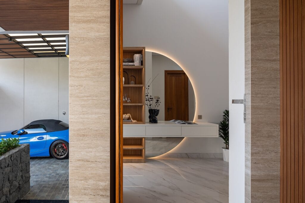 Tantangan berikutnya adalah menghadirkan kesan mewah tanpa kehilangan kehangatan. Melalui perencanaan yang matang dan kontekstual, solusi diwujudkan dengan kombinasi material kayu natural, batu alam bernuansa terang, dan furnitur bernada clean. Terlihat juga lengkungan pada elemen dinding dan cermin menjadi aksen visual yang lembut, memperhalus transisi antar ruang. Pendekatan ini umum diterapkan apalagi untuk daerah di Solo, Solo Baru, Sukoharjo, Karanganyar, Sragen, Klaten yang dirasa cukup panas di dalam rumah. Apalagi bagi orang yang mencari kemewahan yang ditampilkan secara tidak berlebihan, melainkan hadir lewat proporsi, detail, dan kualitas material.