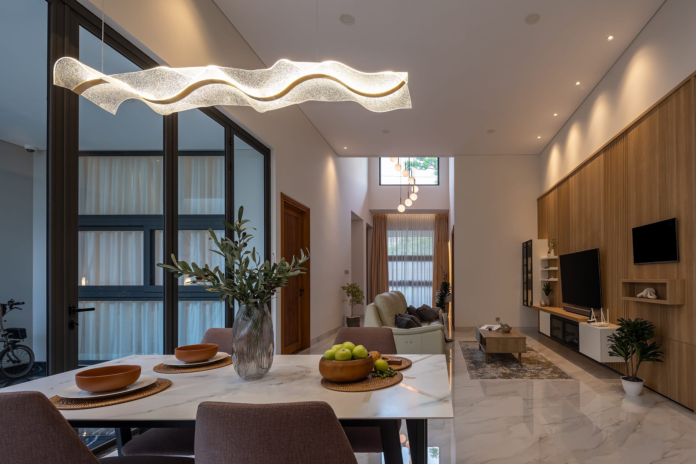 ConArch Studio menjawab kebutuhan akan kenyamanan hidup jangka panjang. Area ruang keluarga dan ruang makan dirancang terbuka dengan koneksi langsung ke taman, memungkinkan cahaya alami dan udara segar mengalir optimal. Inilah solusi menyeluruh. Interior rumah satu lantai yang estetis, sehat, fungsional, dan selaras dengan gaya hidup tropis modern yang sedang banyak dicari di daerah urban Indonesia.