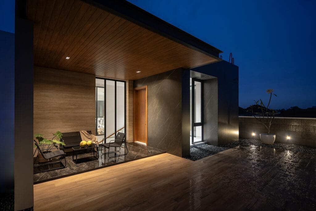Layered TogetherNest – Ibarat sebuah komposisi ruang yang berlapis rapi antara perlindungan dan keterbukaan. Bidang-bidang fasad yang masif disusun dalam sebuah ritme yang tenang, mengalir seperti dinding yang bernapas. Cahaya menembus di sela lapisan, menciptakan permainan bayang dan kedalaman visual yang lembut. Di sinilah rumah menemukan karakternya, tegas dan hangat, tertutup dari luar namun terbuka bagi yang mengerti, sebuah safenest bagi keluarga yang tumbuh bersama di dalam kedekatan, privasi, dan kehangatan yang terlindungi.